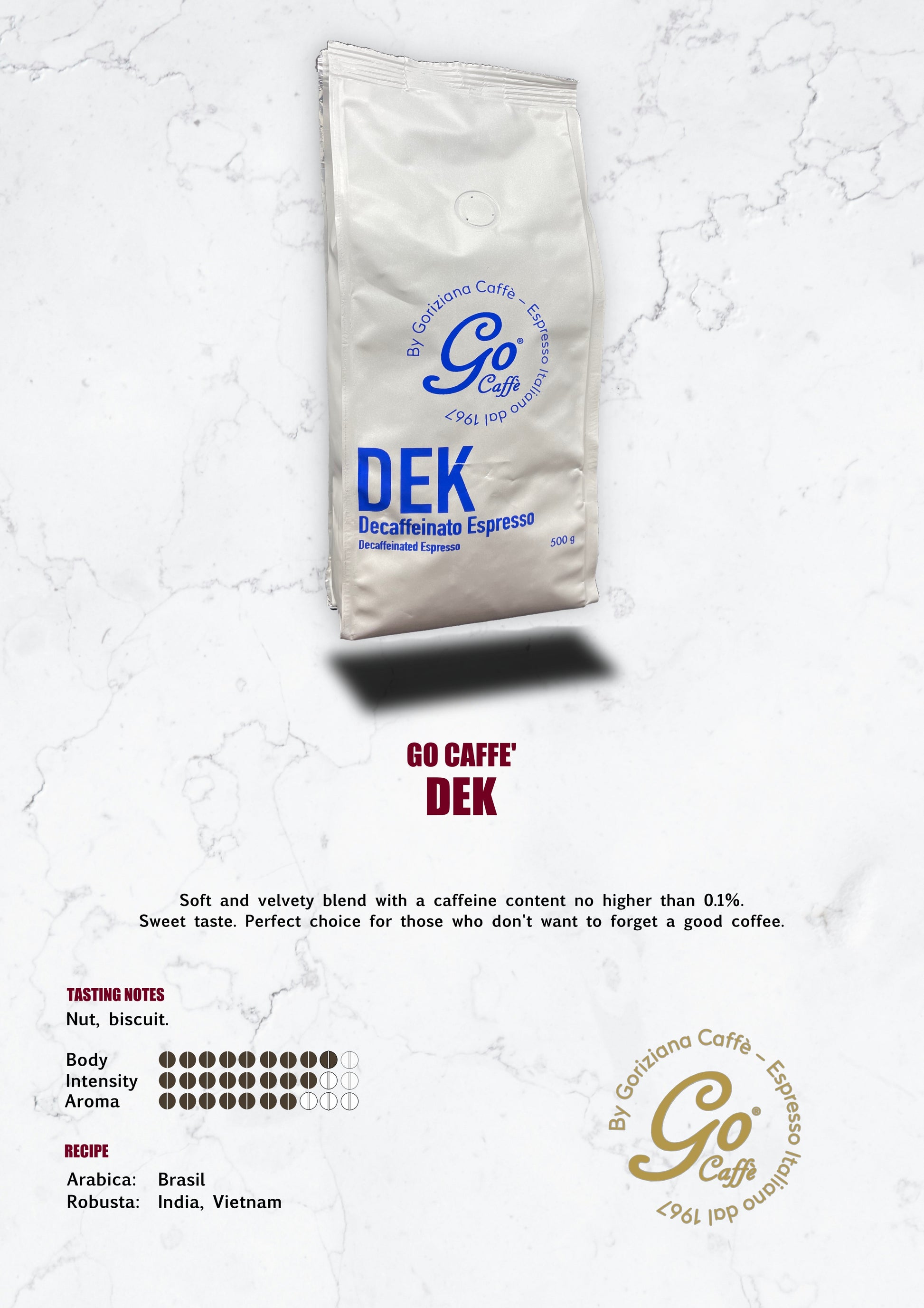 De Go Caffè-lijn van Goriziana Caffè komt voort uit het streven naar uitmuntendheid. DEK is een heerlijke, zachte koffieblend met een fluweelzachte structuur en een cafeïnegehalte van maximaal 0,1%. De subtiele, zoete smaak maakt deze koffie een perfecte keuze voor liefhebbers die willen genieten van een goede kop koffie, zonder de effecten van cafeïne. Met DEK hoef je nooit concessies te doen aan smaak en kwaliteit, ook niet als je kiest voor een cafeïnevrije optie.